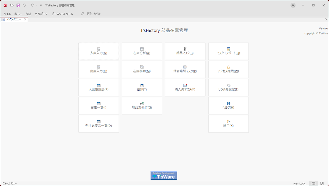 ※Accessをお持ちでない方、あるいはAccessのインストールされていない複数のパソコンで利用をされたい方向けに、Microsoftより 無償のAccessランタイムが提供されています(デザインやコード編集不可などの動作制限あり/T'sFactory製品外のためサポート対象外です)。下記よりダウンロードできます。