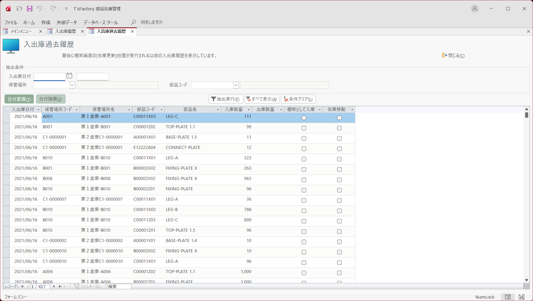 - 部品の入出庫データは単品ごとに入力しますが、それらの履歴は一覧表示で確認することができます。履歴を見ることによって、入出庫の実績や流れを確認できるとともに、画面より修正することも可能です。