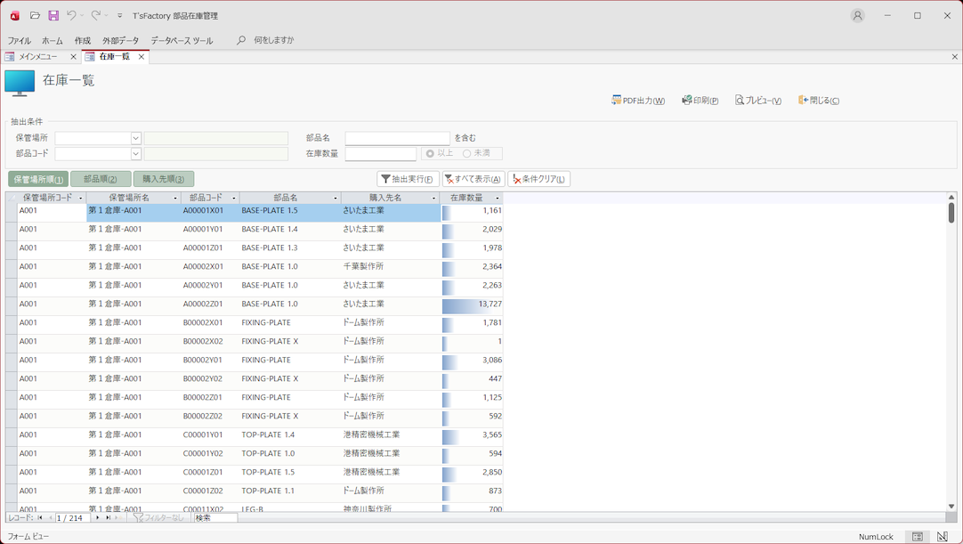- 現在の在庫明細の一覧は、さまざまな角度で抽出したり並べ替えたりすることができます。例えば、特定の保管場所にある部品を一覧表示したり、さまざまな保管場所に分散している特定部品の在庫を一覧表示したりすることができます。また、保管場所順や部品順、購入先順に並べ替えて一覧表示することもできます。