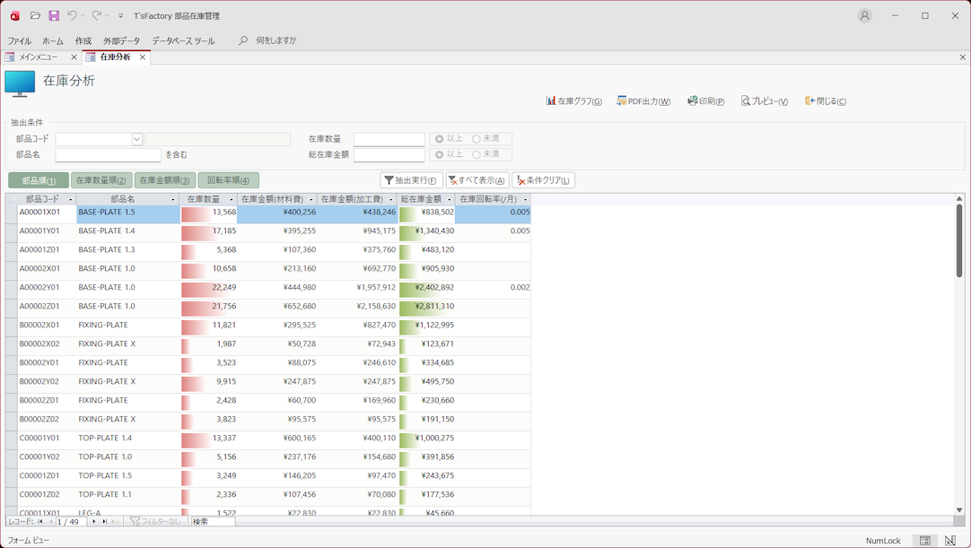 また、どの部品がどこにいくつあるかといった現品管理はもとより、在庫金額や回転率など、経済的な面からも在庫状況を把握することができます。