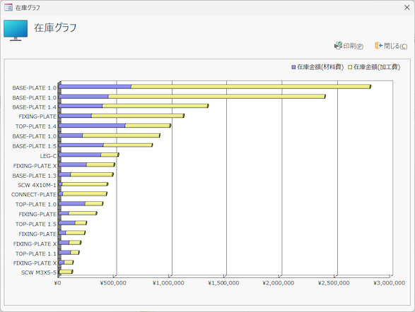 - 在庫金額の高い部品20点について、グラフ表示によってそのコストの全体像をビジュアルに把握することができます。