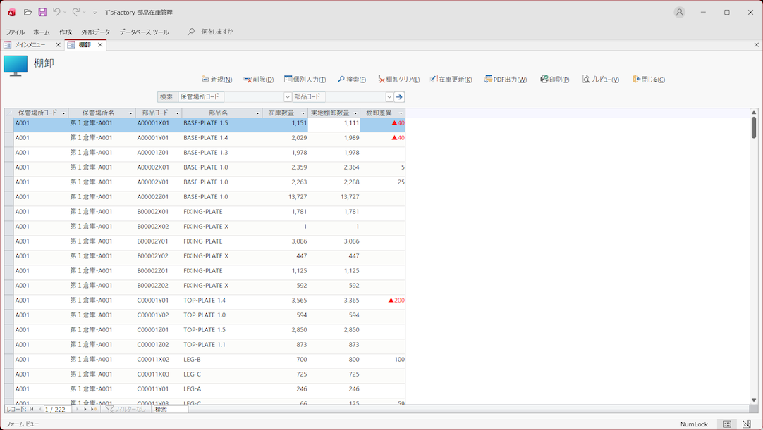 - 実地棚卸によって得られた正確な実在庫数量は、データ上の理論在庫数量と対比しながら入力していくことができます。差異分析も可能です。また、入力された実地棚卸数量は、ボタン1つで、データベース上のすべての保管場所・部品の在庫情報に反映させることができます。
