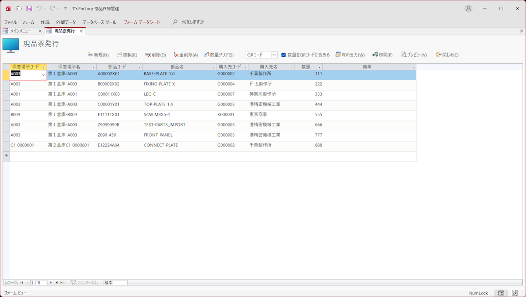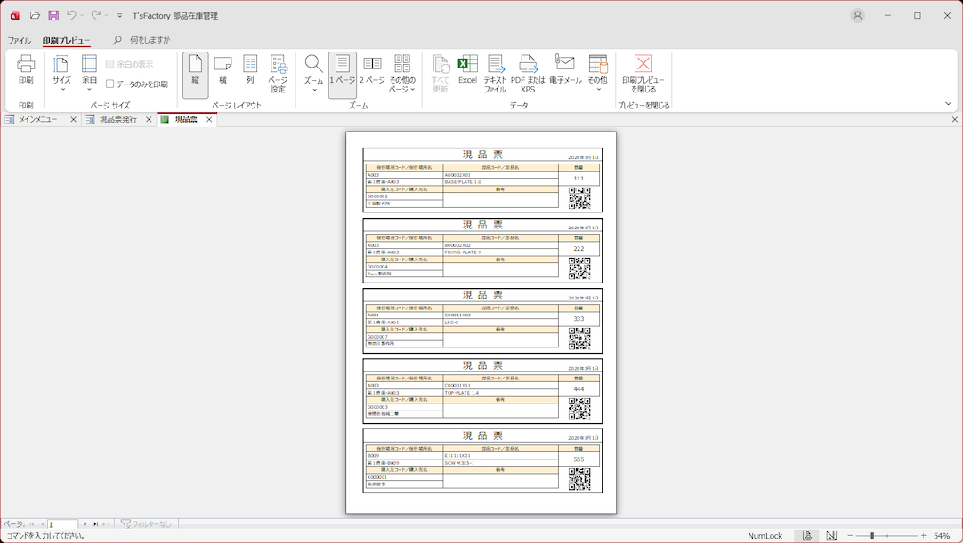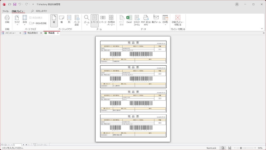また、部品コードや保管場所コードのバーコード票の印刷機能も備えており、市販のバーコードリーダー(USB接続やBluetoothワイヤレスのもの)を用意することによって、直ちにバーコードによる入出庫データの入力や在庫管理を実現できます。