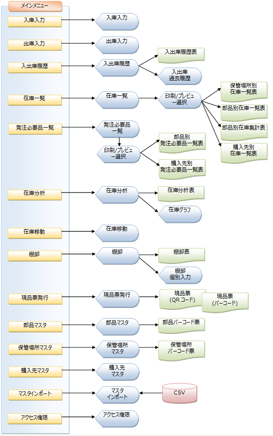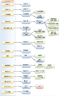 本アプリケーションで操作する、「メインメニュー」画面から表示される各画面のフロー、またそれに関連した帳票やファイルのフローの概要は以下の通りです。