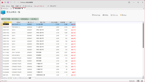 - この画面を開くと、発注の必要な部品が一覧表示されます。個々のデータを閲覧して、その内容を確認してください。