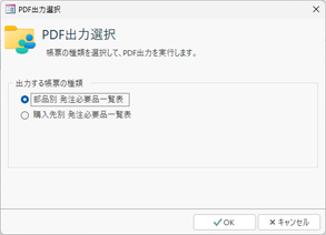 | PDF出力 | 「部品別発注必要品一覧表」または「購入先別発注必要品一覧表」をPDFファイルに出力します。帳票選択などの操作は[印刷]ボタンと同様です。![]() |