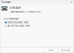| 印刷 | 「部品別発注必要品一覧表」または「購入先別発注必要品一覧表」を印刷します。このボタンをクリックすると「印刷選択」画面が表示されますので、いずれかの帳票を選択して、[OK]ボタンをクリックしてください。