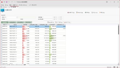 入出庫データを元に、主に金額面から現在の在庫の明細を部品別に集計して一覧表示する画面です。特定の条件でデータを抽出したり、並べ替え表示したりすることもできます。