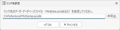 • 本アプリケーションを初めて使い始めるとき、もしアプリケーション・データベースファイルと同じフォルダに TFctSamp.accdb ファイルがあると、自動的にそのファイルにリンク先が設定されます。必要に応じて、あとで他のファイルに切り替えてください。